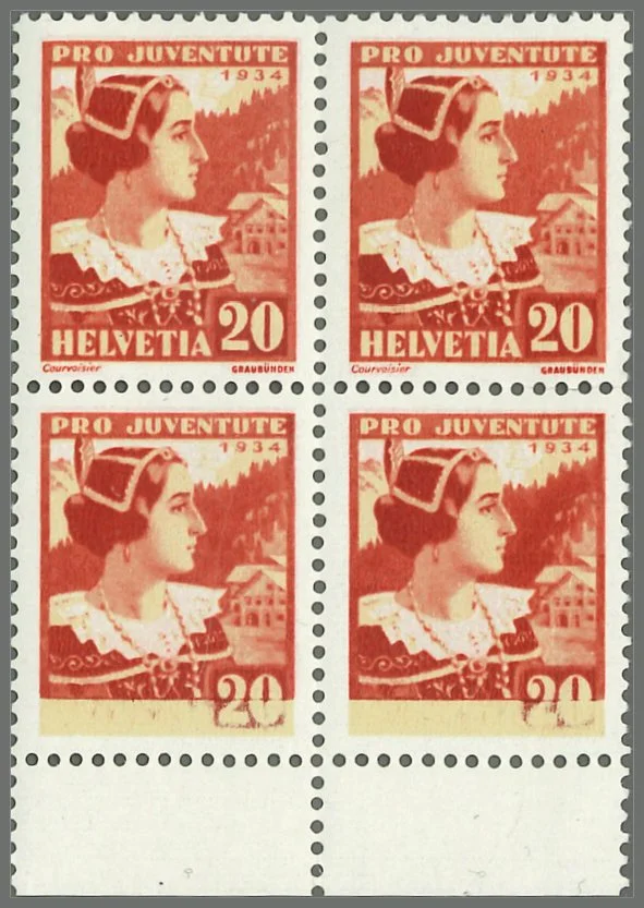 Seltene Abart der Pro Juventute 1934: Im unteren Paar dieses Viererblocks fehlt die Aufschrift „HELVETIA“. Solche markanten Druckausfälle sind extrem selten und zählen zu den begehrten Raritäten der Schweizer Jugendmarken.